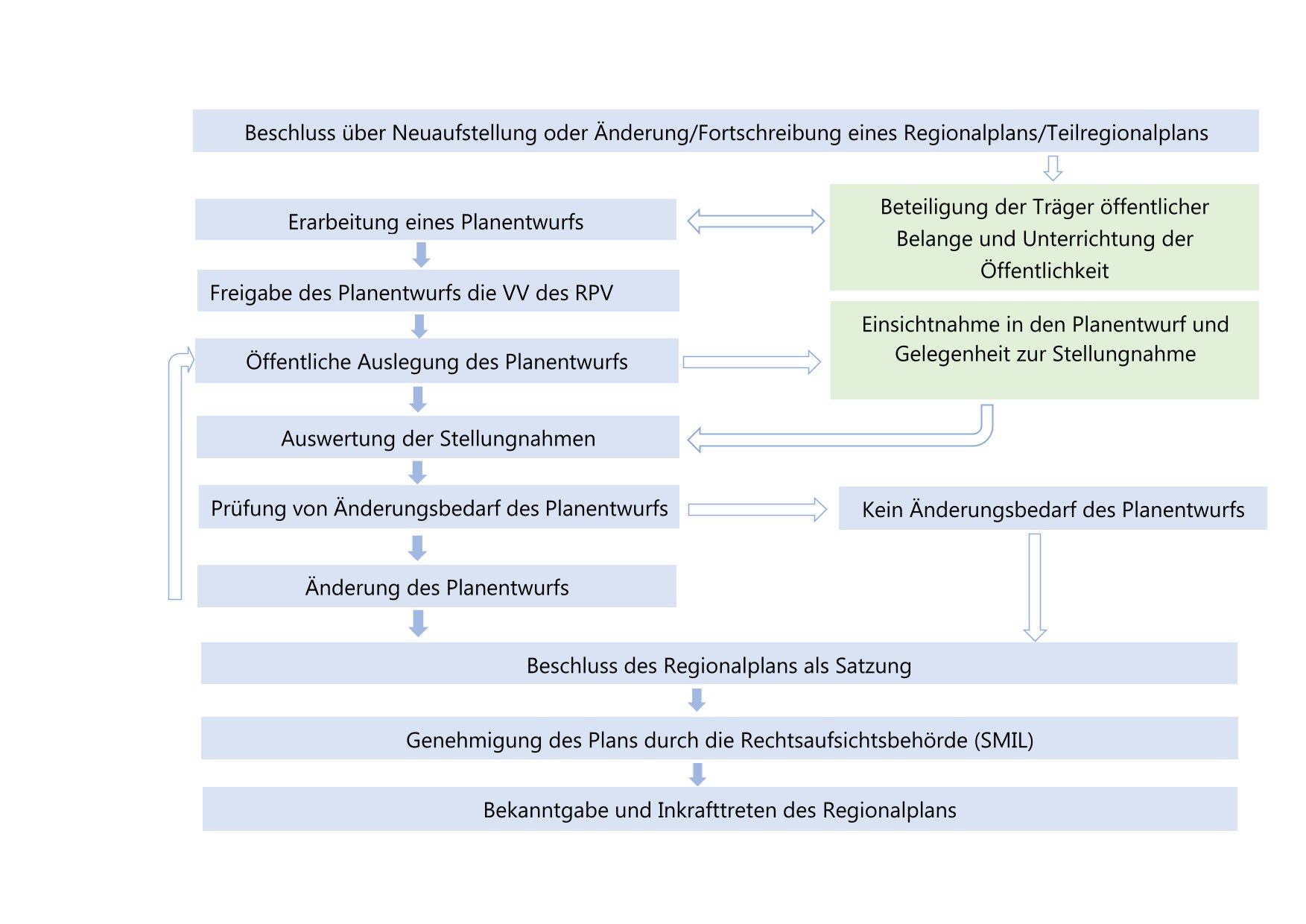 Die Aufstellung des Teilregionalplans ist Ziel eines komplexen, formalisierten Planungsprozesses. Städte, Gemeinden und alle weiteren von der Planung berührten Institutionen und die Öffentlichkeit bekommen dabei die Gelegenheit, ihre Anforderungen und Gedanken in die Erarbeitung des Teilregionalplans einzubringen. Der Prozess wird mit folgender Abbildung vereinfacht dargestellt:
